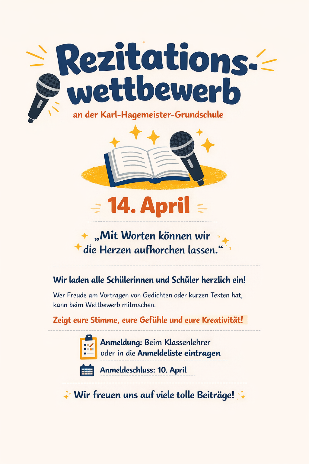Ob lustiges Gedicht, spannende Geschichte oder ein kurzer Lieblingstext – beim Rezitationswettbewerb könnt ihr zeigen, wie lebendig Worte werden können. Mit Ausdruck, Mut und ein bisschen Bühnenzauber könnt ihr das Publikum begeistern. Ganz nach dem Motto: „Mit Worten können wir die Herzen aufhorchen lassen.“